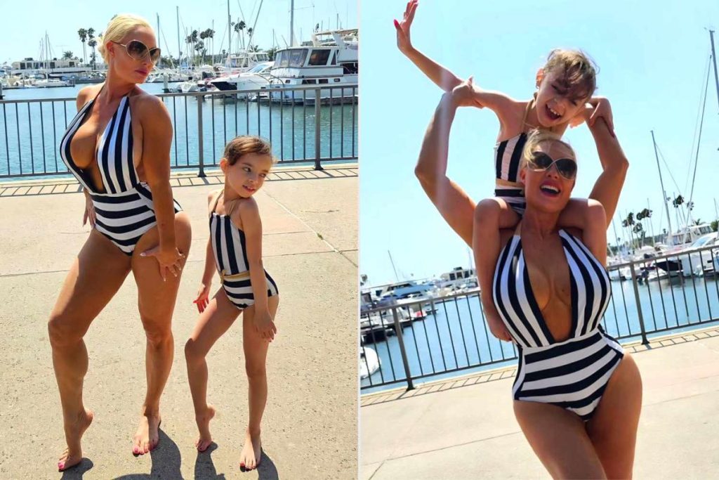 The model mom, 44, shared another fun photoshoot with daughter Chanel, 7, as they donned matching black and white striped swimwear and posed together amid a family pool day.