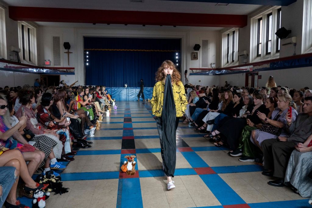 A saxophonist who ordinarily busks on the subway sounded the opening notes of George Michael’s cornball hit “Careless Whisper” as the models walked across the linoleum floor. A handle for one of the bags was an oversized spoon. Some dresses had a train in the front, which the models carried in their teeth. One model walked the runway with a faux banana, aging and brown-spotted, slung on leather straps as if it were a cross-body purse.